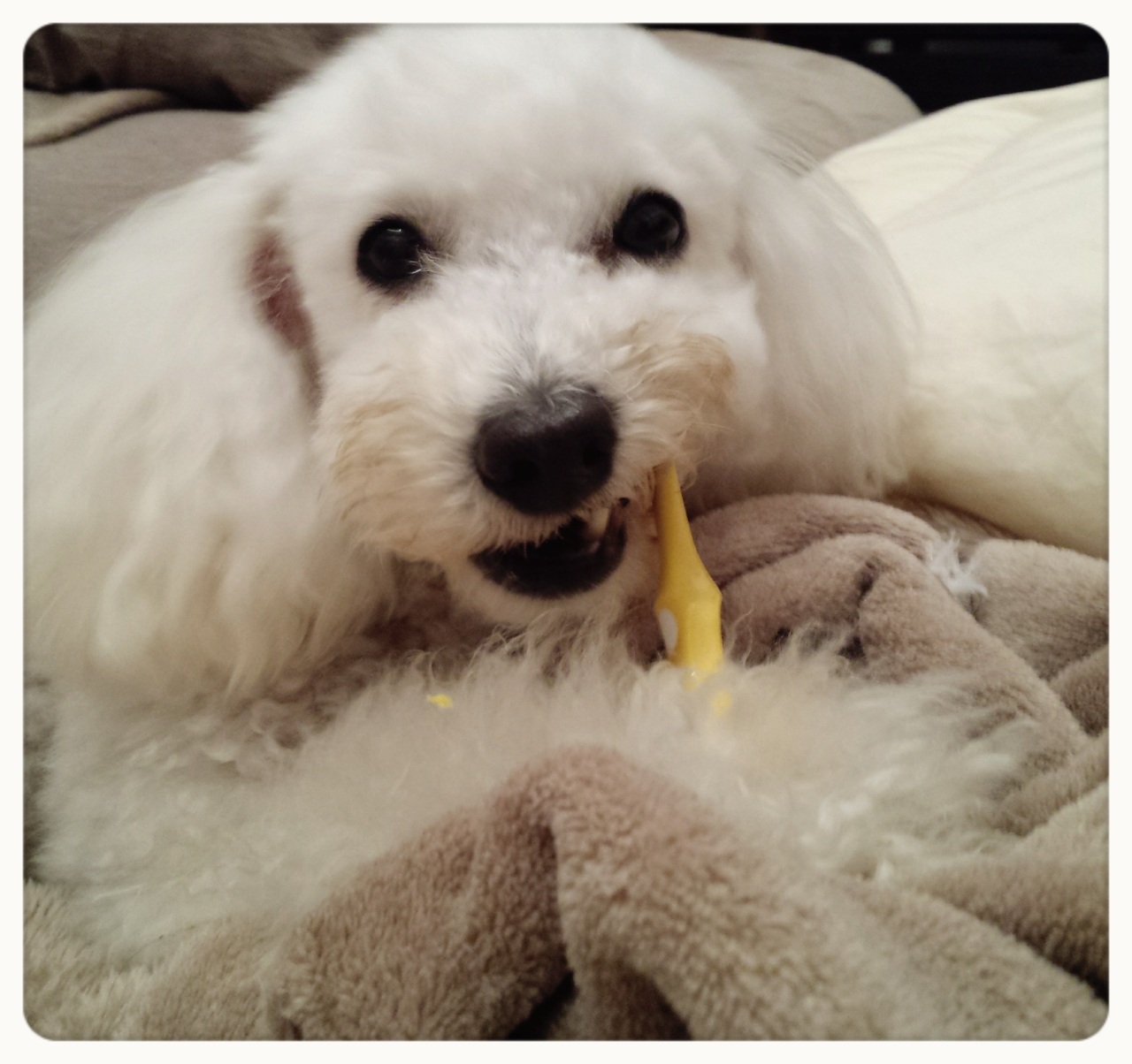 自力 歯磨き粉の記事UPして、掃除でもしようと寝室行ったら…ルーシーが自力で歯磨きしてた(゜ロ゜;ノ)ノルーシーの場合は歯じゃなくて、お顔洗った方がいいと思うよ(笑)てか、その歯ブラシ…机の上にあったはず(-""-;)