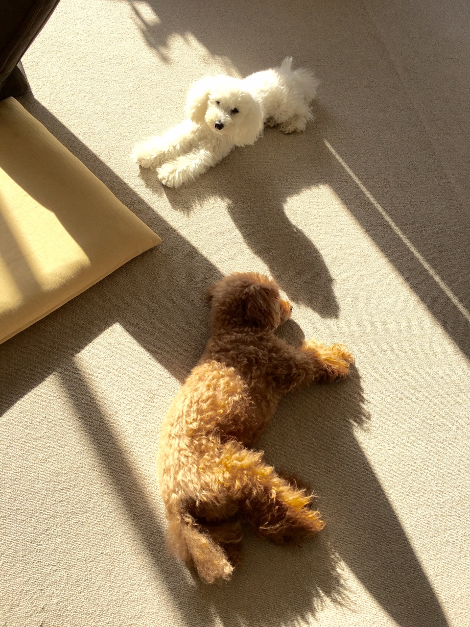 そーゆーことね 明け方...目を開ける度にベッドの下でお座りして鳴いてるバックス...その都度ベッドにのせてたんだけどリビングで朝陽を浴びて日向ぼっこがしたかったらしく...ブラインド開けろって事だったらしい(°_°)冬が近いって事ねルーシーが意地悪でベッドに上がれないのかと思ったわ(笑)