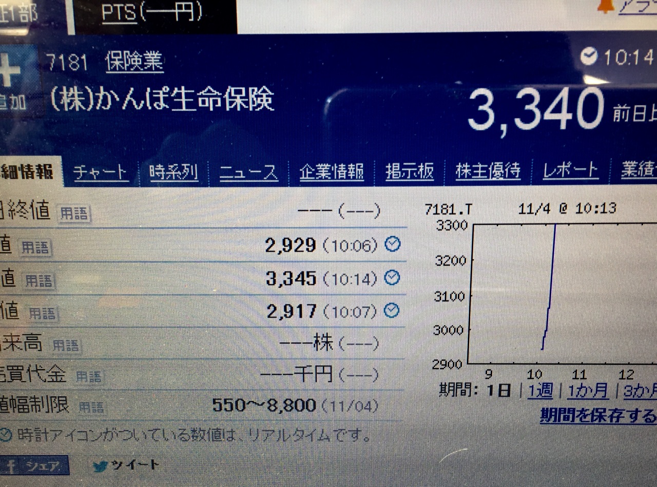 新規上場♪ 株はやらないし、相続した株も全部売却したけど...郵政3銘柄だけは気になり、かんぽ生命だけ新規公開株ゲットしたのあがってるぅー(((o(*゚▽゚*)o)))小心者だから初値で半分売りましたp(^_^)q