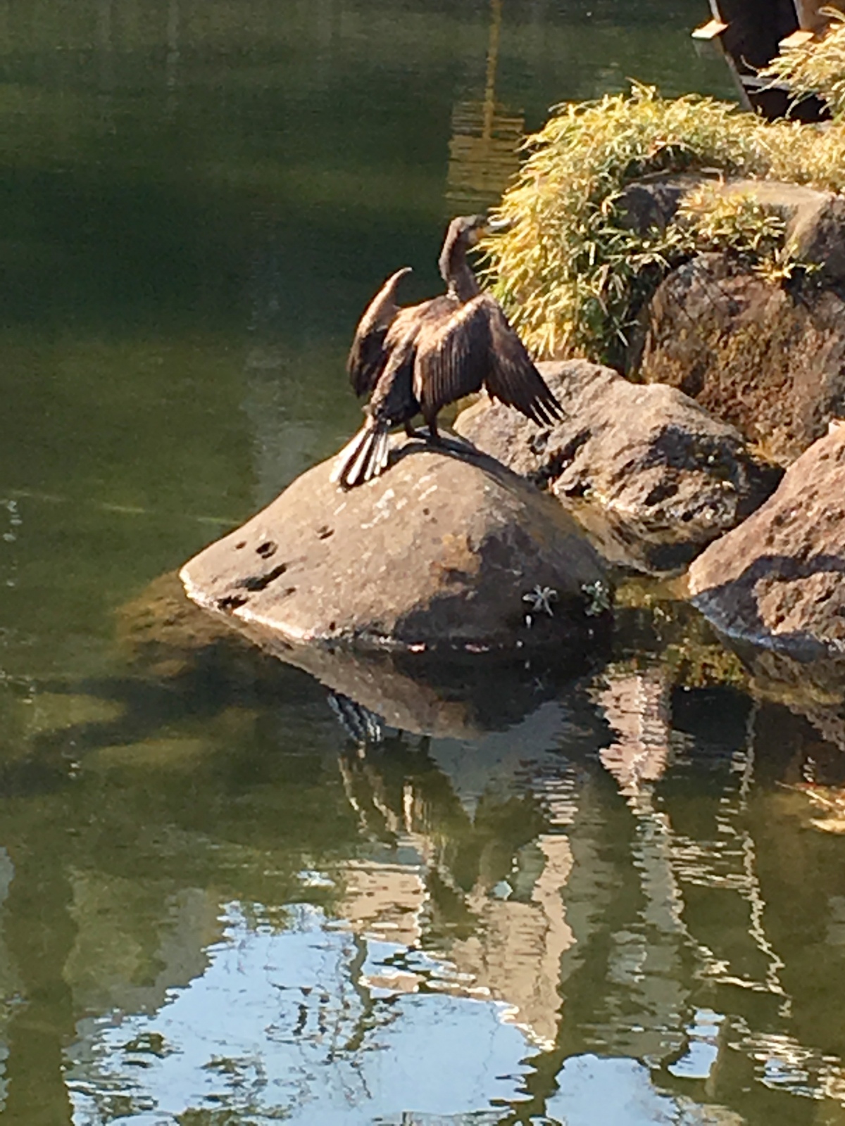 鵜 近所の公園亀も鯉もいなくなり、挙句、中洲に石を敷き詰めたせいか毎年来てた鴨も来なくなり...全くもってつまらない公園にT^Tと思ってたら、鵜らしき鳥が迷い込んできてた...この公園いけてないよと教えてあげたい